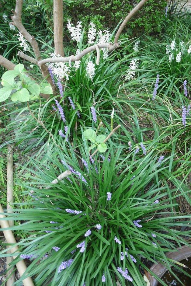 手前の藪欄は(淡紫色の小花を多数穂状に開く:実は黒い) 開花時期は7/25頃〜10/ 末頃。 熨斗欄・藪欄も、日陰に生え、日本庭園の木々の根元などに、 アクセントとして植えられることが多い。 「葉が斑入り(ふいり)のものもあります」 藪のような所に生え、葉が欄に似ているから、藪欄と言う。 実は黒い丸形。 別名 「山菅」(やますげ) 葉の細い「龍のひげ」というのもあります。同じ仲間です。 これらの根の瘤を乾燥させたものを、 麦門冬といい、強壮剤とされます。 意外だけど、藪欄・熨斗欄・龍のひげ、共にゆり科です。(以上 カタログ:事典より) どちらも暖かい沿岸部に自生します。