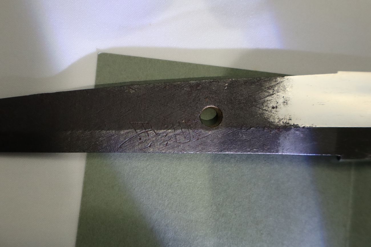 4. 銘の位置:茎中央よりやや上、控えめに刻む ・茎の中央よりやや上に刻まれることが多い ・刀姿が大鋒・身幅広めのため、銘が相対的に小さく見える ・銘の周囲に鑚の“逃げ”が少なく、地鉄に溶け込むように刻まれる 5. 在銘が少ない理由 ・兼氏の作は南北朝期の実戦刀で、磨上げが多い ・銘が浅いため、研ぎで消えやすい ・そのため、現存作の多くは「無銘志津」「伝志津」として扱われる